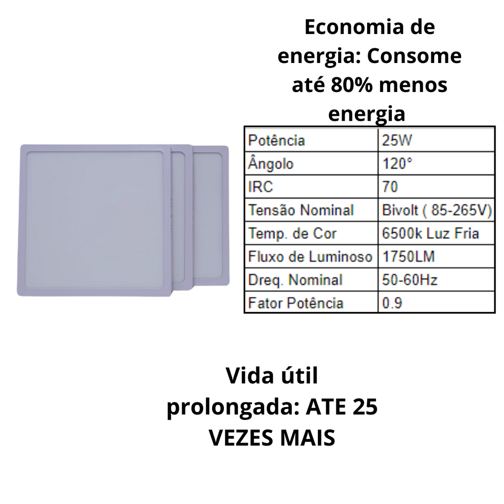 Cada unidade entrega 1750 lúmens de iluminação uniforme, com luz branca fria (6500K) e ângulo de abertura de 120°, garantindo excelente distribuição da luz. A tecnologia LED permite até 80% de economia de energia e uma vida útil até 25 vezes maior em comparação com lâmpadas comuns.